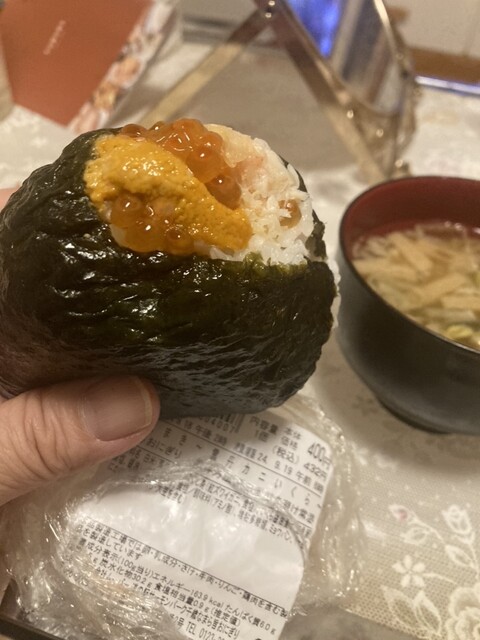 もうなくなっていて しばらく売り場に出なそうなので1番お高いうに、かに、いくら432円と卵黄肉そぼろ302円を購入 塩っけは少なめです 私は卵黄のほうが濃厚で好きです 卵黄が三角おにぎりの端っこ2箇所についてました