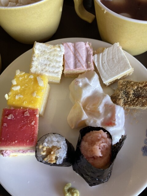 キムチチャーハン 麻婆豆腐 塩焼きそば ナポリタン他サラダやお汁粉 カレーにデザートも多め お寿司も小振りで食べやすくちゃんとしっとりしてます