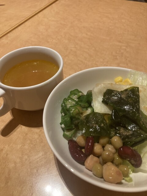 サラダとスープはビュッフェで1回利用出来ます ドリンクは150円追加で色々選べます ハンバーグすっごーい美味しい ソース最高 柔らかさ完璧 ドリンクはカフェラテアイスが選べるなんて凄くない?イケメンの外人店員さんに緊張