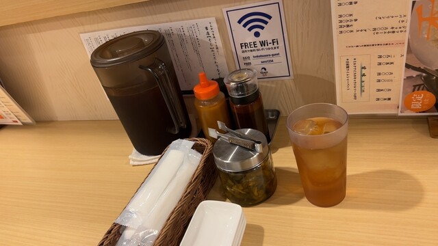 荻窪駅前の一等地、12時頃訪問。先客1人とちと寂しい。カウンターに案内される。お冷はなんと黒烏龍茶。荷物は置き場所がないのか隣の椅子へ置くように案内される。