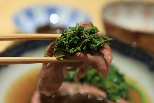 低温ローストビーフはニヤけるほど柔らかく、ネギ塩麹ダレと実山椒醤油がまた美味。