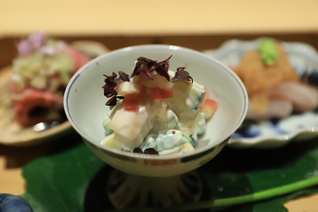 ズッキーニ、みる貝、蓮根の白和。チーズを合わせて濃厚に、茗荷でピリッと調和。