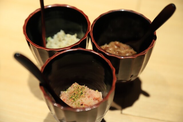 山椒味噌、塩ポン酢、木の芽ポン酢で変化を楽しむ。