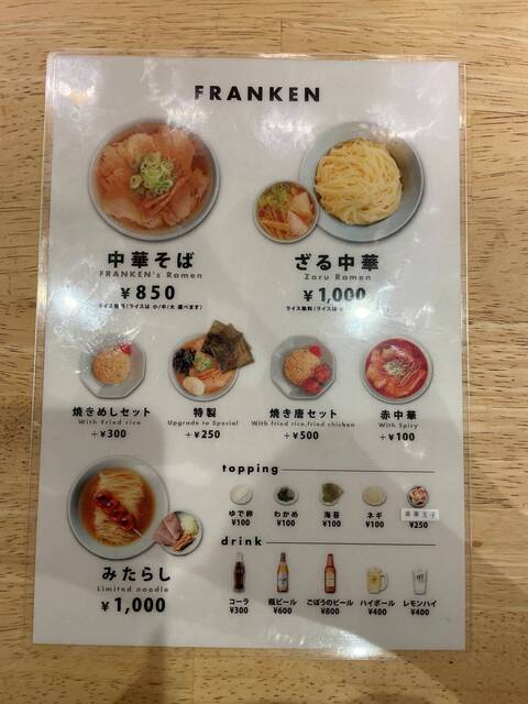 麺類メニューは中華そば、ざる中華が2大メインでしょうか。みたらしという一風変わった麺類もありました。ただ、今回は初訪問という事で、最もシンプルな中華そば(¥850)に焼きめしの小セット(¥300)。ちなみに焼きめしは普通サイズでも同一価格でした。お店の入り口前にある券売機で食券を購入して店内へ。