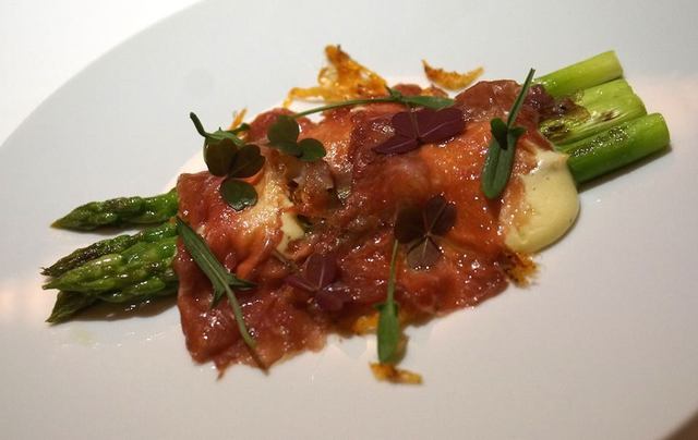 生ハムが加わって、皿全体のうま味は増しているのだが、生ハムの味が勝ちすぎていて、アスパラが影になっているような印象を受けるときである。