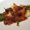 アスパラに、桜肉と桜海老という、春の風情を漂わせる食材が合わされている。