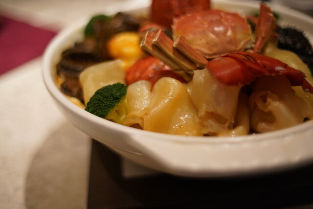 盆菜一皿目は、伊勢海老、フカヒレ、アワビ、ナマコ、ガチョウのもみじ、魚の浮袋、肉団子、豚足、ブロッコリーが盛られた。