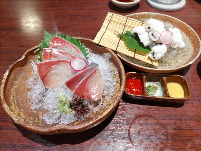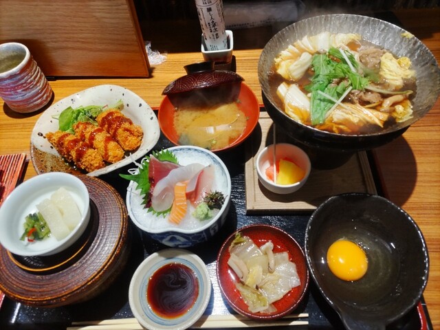 小鍋のお出汁が良い感じ、お造りぶ厚め〜(^^)、豚カツは衣が薄くクリスピーでお肉感しっかり。