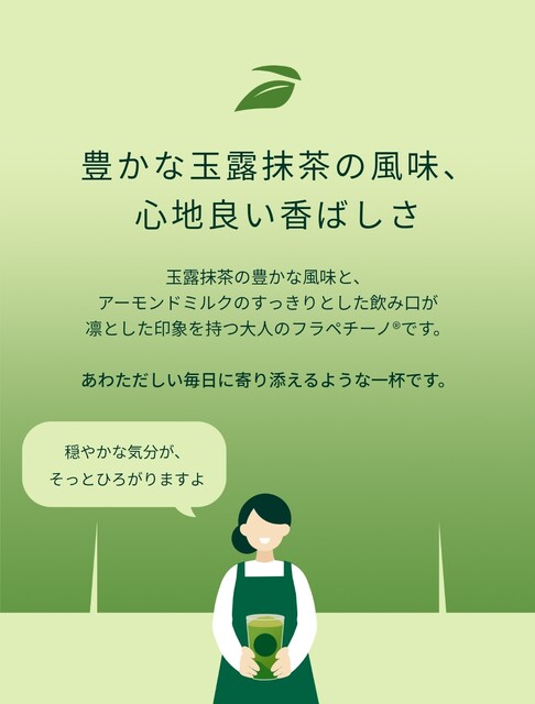早速飲んでみると、ホイップクリームを抜いているので、あっさりとした口ざわりで、そこに抹茶とアーモンドとキャラメルの3つの香りが三位一体となり、複雑で独特の個性をもった、爽やかなドリンクに仕上がりました。抹茶のクセも、良い意味で落ち着いて、新年の正月明けの雰囲気にピッタリ合っていると思いました。