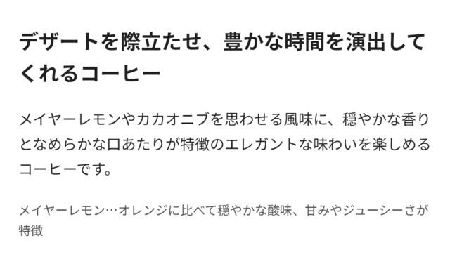 スターバックスの公式ウェブサイトには「毎日でも楽しみたくなるコーヒー。ココアやプラリネを思わせる風味、なめらかでバランスのとれた味わいのコーヒーです。スターバックス1号店があるシアトルのパイクプレイスマーケットの名前を冠したコーヒーは、一日を通して、また毎日でもお楽しみいただきたい味わいです」と紹介されています。