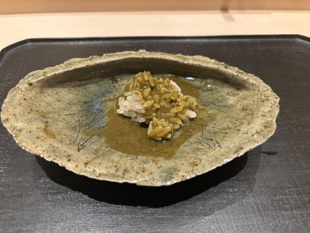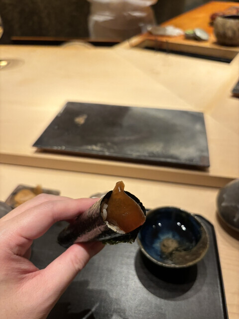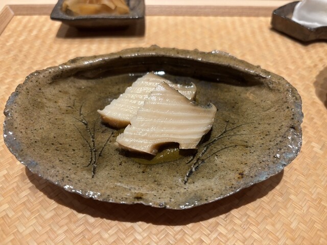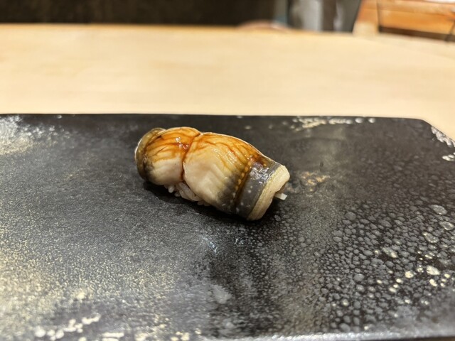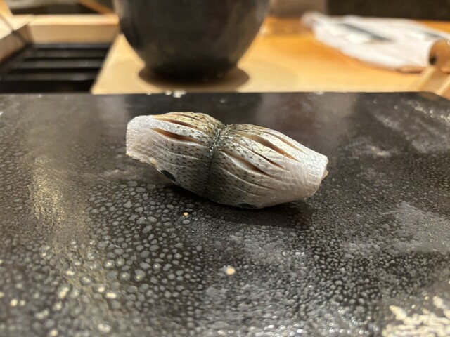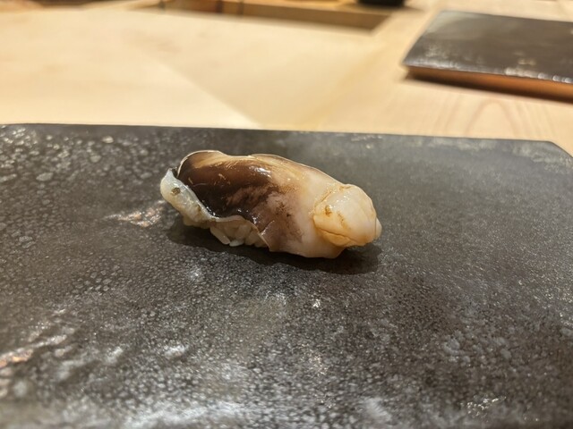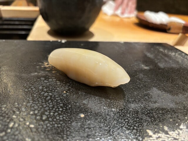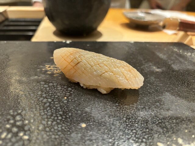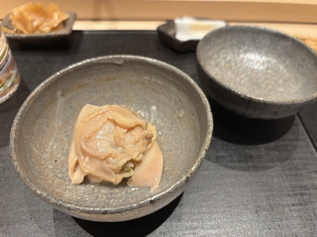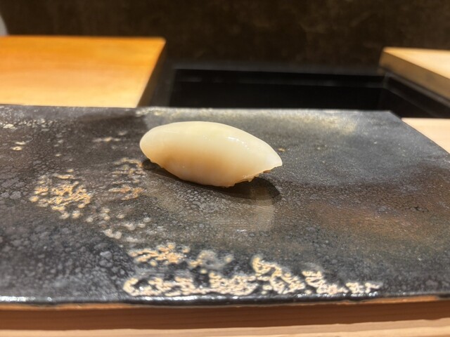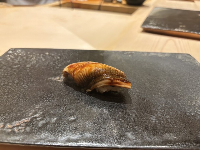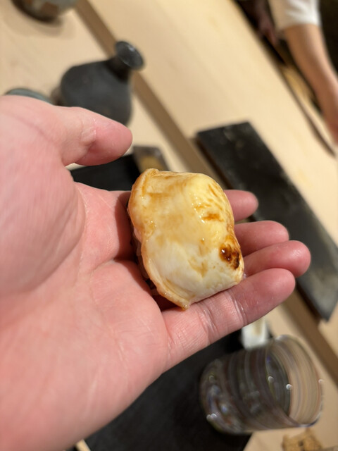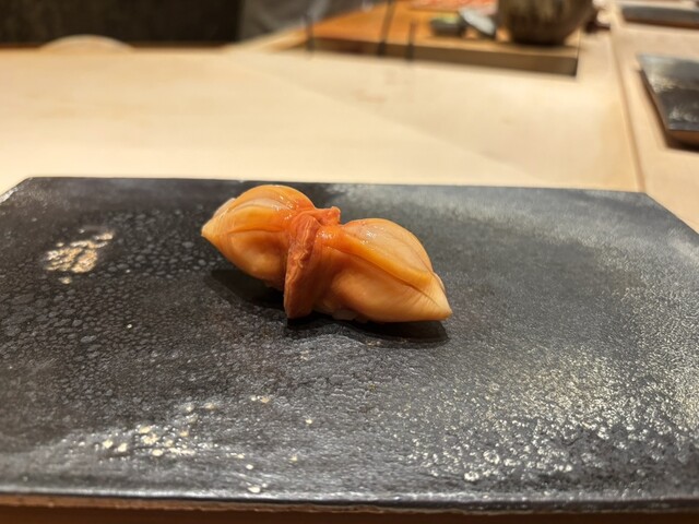 特にトリ貝は忘れられない1カンだった。産地は丹後!じゃなくて、能登だったんですが、身がデカくて香りも最高。何より仕込みが普通と違い、生と火入れの良さを両どりするためにサッと究極の黒崎の出汁に通した後に炭火で炙って握る。香りと甘味と食感を最高に引き立てた究極の1カン。