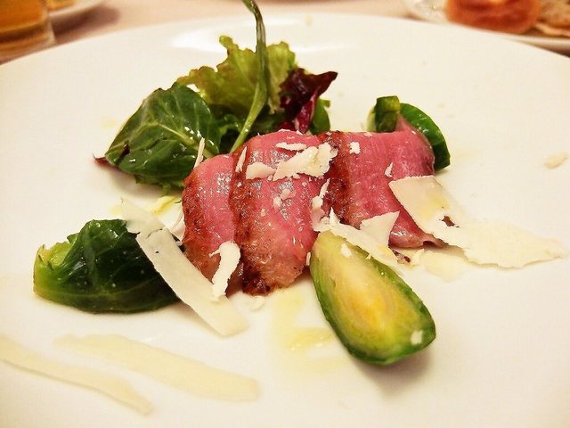 塩釜で焼き上げた鴨胸肉と芽キャベツカチョリコッタ