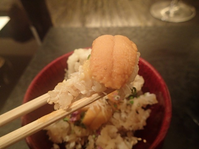 8品目は白魚、雲丹の炊き込みご飯と赤出汁。