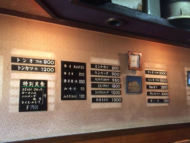 壁のメニュー。洋食屋さんはライスなども別料金が多いです。