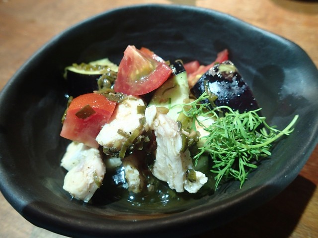 水ナスとミディトマト、ヤゲン軟骨のネギ山椒オイル