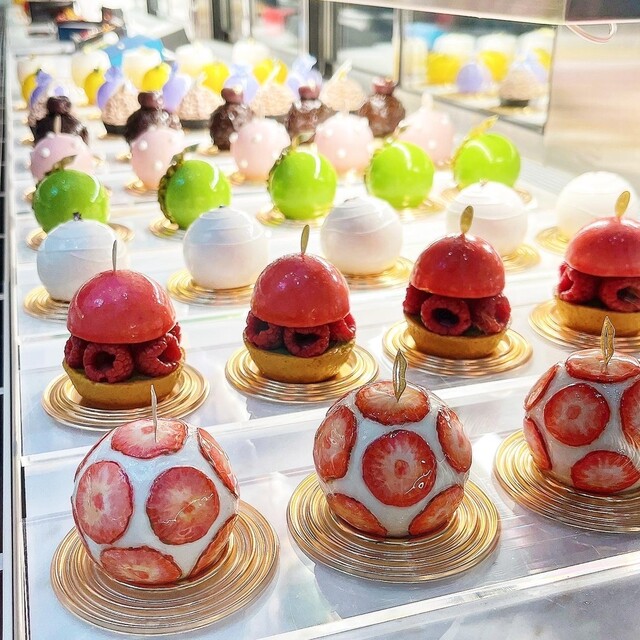 一目で魅惑されるのは、アメリカの国際コンクールで優勝されたグランシェフ藤田浩司さんが手がける、造形美と言えるパワーストーンのような、色とりどりのフルーツタルトの数々。