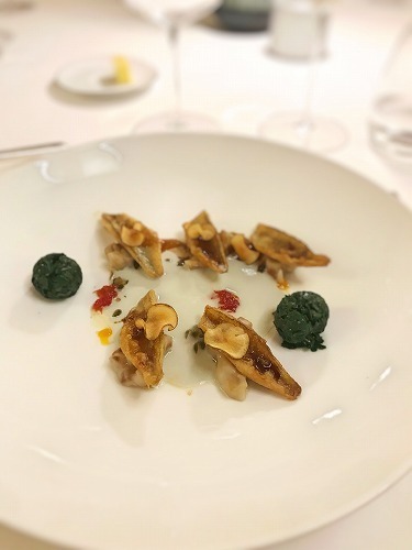 お昼はボーヌの町でワインのお祭りを楽しんで...ブルゴーニュワインのこともソムリエさんにたくさん聞いて、またボルドーとの違いがよく分かるようになりましたそんなわけでホテルに戻って、この日の夕食はホテル内ミシュランレストランである、MAISONLAMELOISEで。ま、このホテルはここのレストランで食事をする人のためにあるといっても過言ではない、村では超有名なレストランですそれに、レストランの中では比較的リーズナブルでいただけるそうで、例えばパリとかの同クラスのレストランからすると半額くらいみたいですよというわけで、ここでがっつりいただくために昼をおさえたわけですから。早速19:30にレストランへここは大小いろいろな個室っぽい作りに分かれていて、我々は一つのお部屋へこちらがメニューはい、来ましたねぇ...全部フランス語...このレストランは、1920年代からミシュランの星を取得し、1979年、三代目のシェフ、ジャック・ラムロワーズの時に⭐️⭐️⭐️となりました。シェフとしては最年少だったそうです。その後、2005年に一度⭐️⭐️に落ちたものの2007年、再び⭐️⭐️⭐️に復活。現在は2009年から四代目のMOFにも認定されている、エリック・プラ氏がシェフを務めています。楽しみですねまずはお決まりのアミューズから。アイスのコーヒーキャラメルのようなものでコーティングされているフォアグラです。フォアグラの塊をちょい甘のアイスでコーティングされていて、またナッツの香りもいいアクセントになっていて、とろけるような食感こちらは左から、ポテトチップスの上に、牛肉のタルタル、アボカドとラディッシュのムースにキャビア真ん中、チーズクラッカー、マスの燻製、ミルクムース、きゅうりのムース右側は、ハーブ入りソーセージ、ラディッシュということで、これも一口でパクっとねそしてこれね「エスカルゴが中に入ってます」って、どんなんかな?一口で食べてみると、中にバターたっぷりで炒めたエスカルゴが一匹。そして周りはパンのようなもので黒いのはイカスミなんだとか。それが油で揚げられています。中から溶かしバターが口の中に広がるんですが、それが程よい温度で心地よいはい、まだメニューに記載しているものは出てきてませんよ次は、ウズラの卵のミュレット、カエルのもも肉入り赤ワインとマスタードのソーススープの中にカエルの肉が入っています。これも珍しい。ソースがなんとなく、不思議とごま風味がして懐かしい感じがしましたごま、一切使ってないんですけどね。ここまでテーブルについて、ワインなんかを選んだあとお食事が提供されて、早1時間ちょっと。まだ、メニューが出てこないですよでも、のんびりしてるって雰囲気ではなく、この食空間を十分に楽しめる、そんなサービス21:00になってようやく一皿目OMBLECHEVALIER&FOIEGRASmarbred'omble&foiegras|lentilles&champignonsacidulesvinaigrettepommes&chardonnay北極イワナをあしらったフォアグラのパテレンズ豆ときのこリンゴとシャルドネの酸味を利かしたドレッシングをかけて上のまあるいのがフォアグラのパテで、周りに薄く切ったリンゴで巻いています。緑色のはお野菜をレタスで巻いているんですよ。オシャレですね北極イワナってのはあまりなじみがないお魚ですが、フランスでは超高級川魚なんだそうですよ。FILETSDEPERCHEsautesmeuniere&ensuitelaques|topinambour&epinardcapres&pamplemousse|infusionlegerementbeurreeペルシェのムニエルキクイモとほうれん草のお団子わずかなバターをかけてちょうどいい量ですね。とてもおいしく頂けますお次LEGUMES&PERDREAUGRISsousunegeleedemaislegumes&perdreauensalmisauxchanterelles&raisin|sabayonauvinjaune野菜とヤマウズラのサルミトウモロコシのシートを載せ、杏茸とレーズンを添えて サバイヨンソースをかけてサルミというのは、ローストもしくはソテーした肉をスライスしてソースの中で再加熱させる調理法で、主に高級肉のジビエ、特に野鳥料理なんかによく用いられるそうです。とっても柔らかくなるんですねそのあとはおなじみFromagesfrais&affinesチー盛りPlaisirsucreプレデザート洋梨入り洋梨のムースプルンプルンの甘さ控えめデザートそしてデザートが、CITRONensorbetalafeuilledeshiso|meringuecroquantecitroncaviar|maindebouddhaconfite|sorbetal'orange&al'amandeゆずとシソの葉を用いたシャーベット 仏手柑のコンフィ カリカリメレンゲとレモンの果肉 オレンジとアーモンドのシャーベットSHISO...?シソ??紫蘇???紫蘇をデザートに使うという発想がすごいですね。お味は...ちょい微妙でしたがそして最後にコーヒーとチョコレート3時間半くらいかけてゆっくりとお食事並びにその空間を楽しみましたちなみにこのホテルではワインも売っていて...せっかくなのでこれを食事の時に飲みたいなぁ...って言ったら、それは販売のみでレストランでは提供してないんだとか。でもソムリエさんたちといろいろワインを選ばせていただきましたよ。だいたい、€150〜€300くらいがコスパがいいんだとか。お店名前