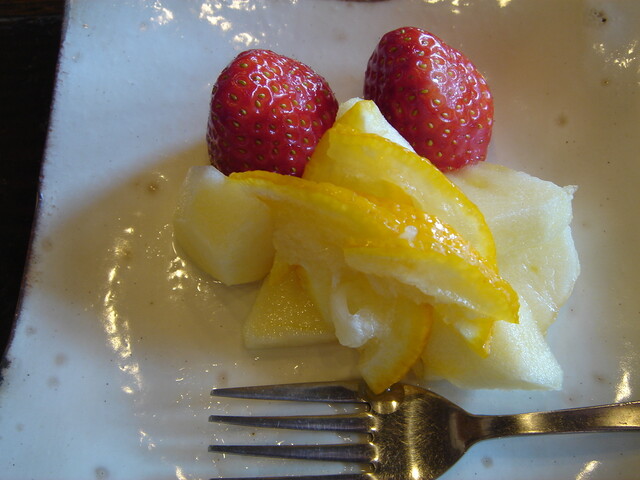 先ほどの筍と鮎の焼き物、そして手作り竹筒の筍ご飯など食べ終え、最後水菓子で口を清める。(以上 山吹コース3000円)