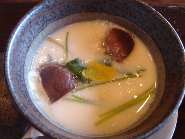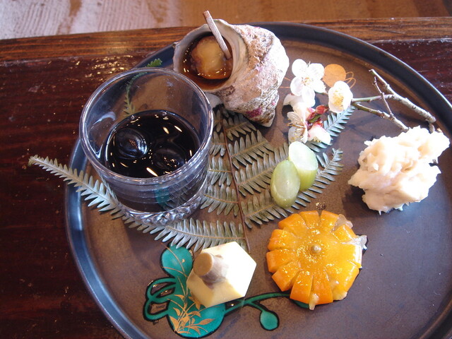 見た目美しい口取りにキンカン、くわい、数の子粕漬、つぶ貝、エシャレットをつまみながら竹筒に入った吉乃川2000円を呑む。そして新鮮な寒鰤のさしみを山葵をすって食べる。とてもキトキトで脂の乗りが良い。そしてしゃも肉の燻製。桜のチップで仕上げたと思われる香りのよい肉は香ばしく、しかも噛みごたえのある美味しさだ。里芋の滑らかな味わいに舌づつみを打ち、最後は蛸飯となって満腹となったところに、水菓子(林檎と柚子)のデザートで口をさっぱりさせる。