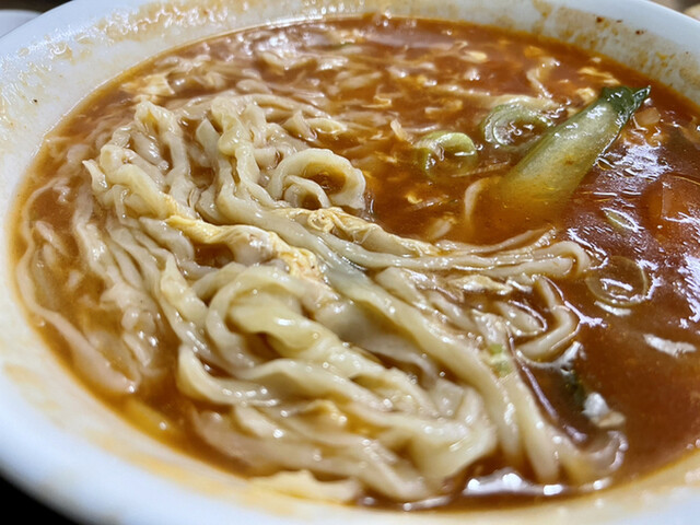 スープは、とろみを伴った、ピリ辛仕立て!