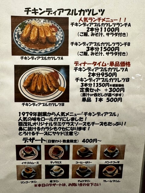 亜茂礼さんのチキンディアブルは、創業当時からの人気メニューで、