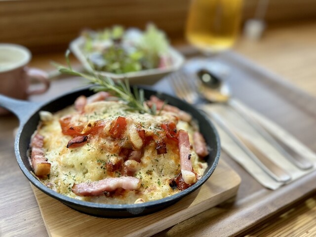 今月のスキレットドリア(夏野菜とベーコンのトマト味)サラダ・スープ付き