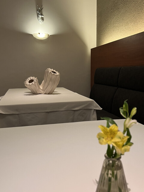 今回はdéjeuner。前回は夜の静謐で少し幻想的な雰囲気を楽しんだが、今回はRC打ちっぱなし壁と漆喰と思われる左官壁の双方に柔らかい木洩れ陽差し込む明るい店内で、前回とはだいぶ雰囲気が違う。そして十分なテーブル間隔を保ちながらも、満卓の賑わいの店内は華やかで、その喧騒が寧ろ心地よい。