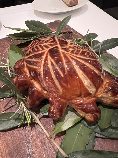 蝦夷鮑; パイ包み 穏やかで丁重。帆立をつかったムースも味を協奏しており肝のソースもいい。ただ個人的にはパイ包みは、マリアカラス風の如く、濃厚で脂のある詰め物が好みなので △