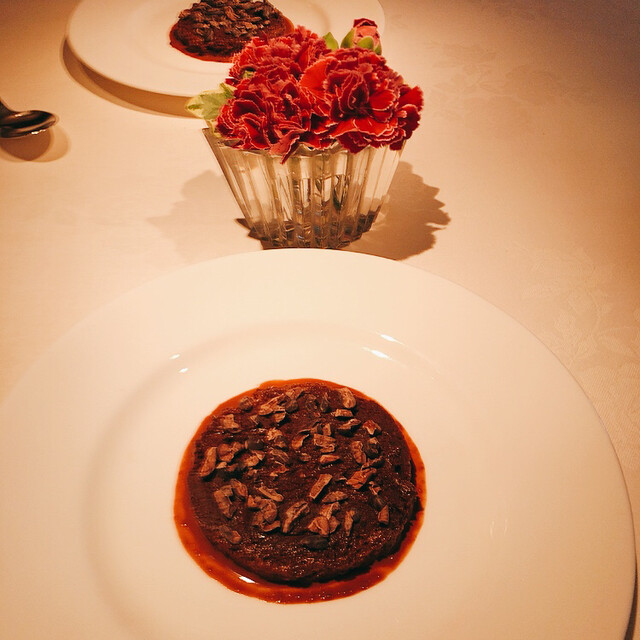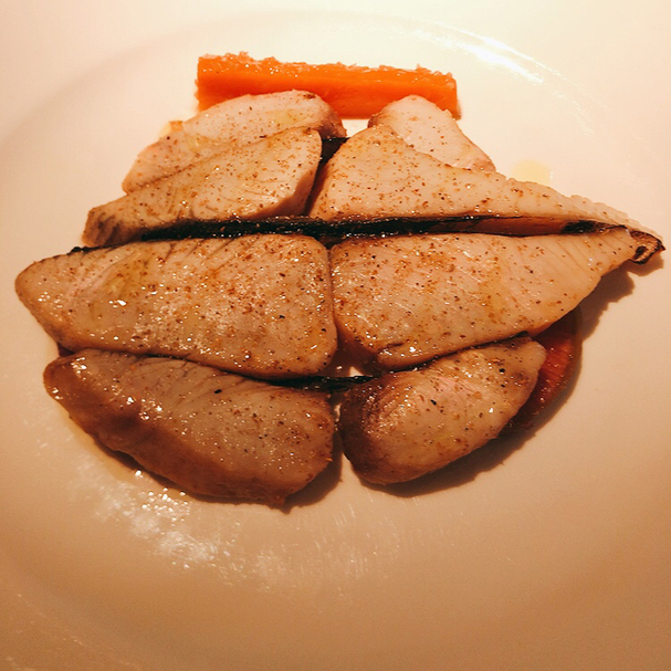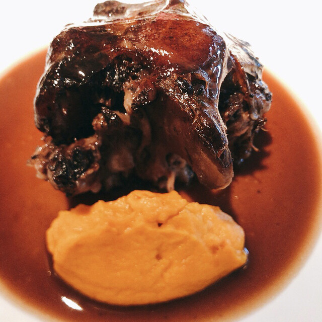 前者は素晴らしいの一言。 よく煮込まれ柔らかいが肉の旨味を残し、シコシコとした歯ごたえのある食感に仕上げられていて舌が唸る。もちろん灰汁取りは完璧なので臭みは一切感じない。酸味を抑えた濃厚な赤ワインソースと添えられた人参のピューレを併せて頂く。braise系の料理は好きなのでよく注文するが、今まで食べた同種の皿で間違いなく一番舌が唸った。
