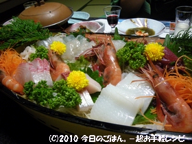 仲居さんがいろいろ並べる中で、舟盛りがどーんっと登場して、一気にテンションアップ!