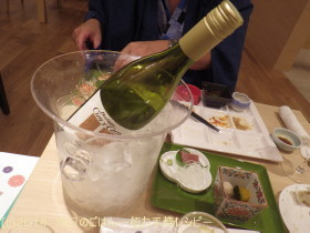 飲み物はボトルで白ワイン。お値段はそこそこだし、お味もそこそこ