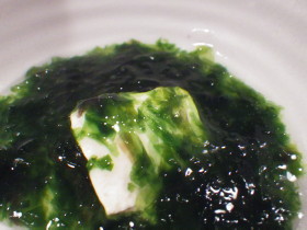 たっぷりのお出汁と青のりの中にお豆腐が入っています。
