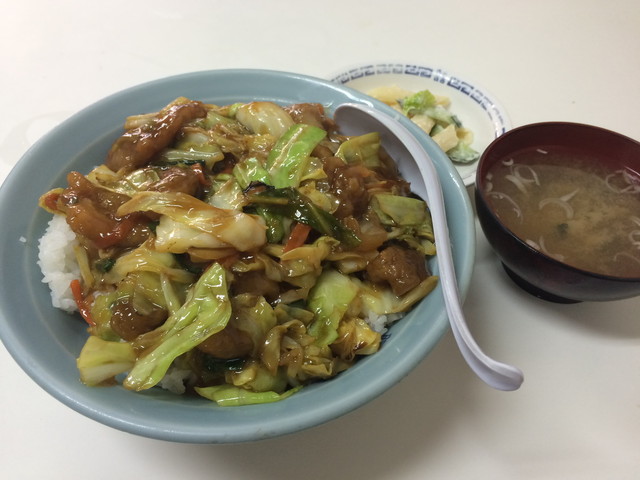 いただいたのは肉丼(大盛り)です。ラーメンどんぶりにガッツリと盛られたご飯に、キャベツと衣のついた豚肉を甘辛く炒められたものがどっさりと乗っています。おまけに小鉢(マカロニサラダ)、味噌汁がついて630円!!私が学生だったときも580円でしたからほとんど変わっていないじゃないですか!