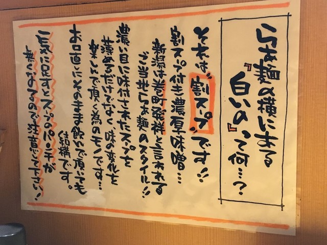 美味しくいただきました。帰宅後に巻出身の友人に聞いてみると巻にある「こまどり」をインスパイヤしたお店なようですね。(味噌ラーメンや割りスープなど)「こまどり」には行ったことはありませんが、行ってみたいものです。