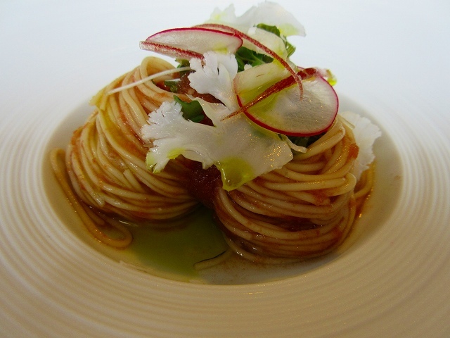 トマトとめかぶのカッペリーニ、バルサミコ風味 フレンチでもカッペリーニを使うとシェフからの説明がありました