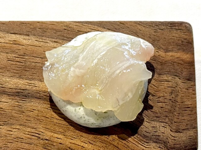 続くニゴロブナのタルティーヌでは、滋賀の伝統食材がモダンにアレンジされて登場。マリネされたニゴロブナはクセがなく香り高く、野生味ある田ぜりやノビルとの相性も抜群。別添えの骨のスープは滋味深く、静かに身体に染み渡ります。