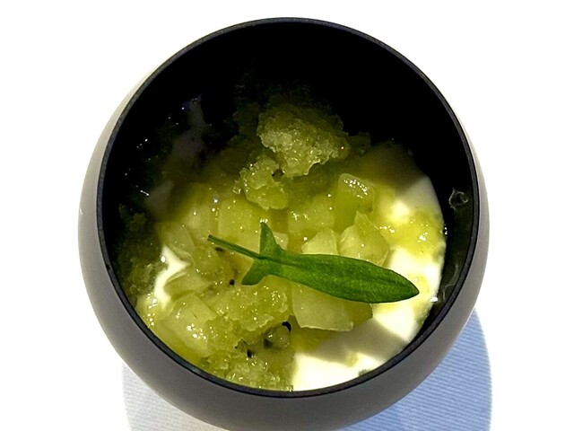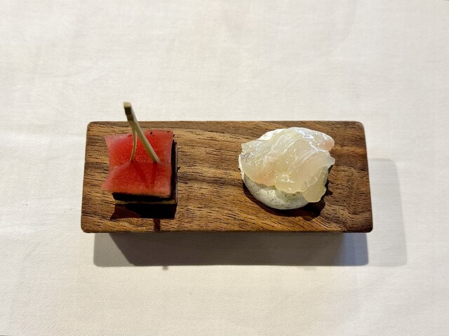 まずはアペリティフからスタート。左から、ファーブルトンという素朴な焼き菓子、豚の旨みがぎゅっと詰まったブーダン・ノワール、紅玉りんごの爽やかな甘さ。対して右側には、スジアオノリを練りこんだメレンゲにわさび醤油のアクセント、上には繊細なトヒラメが乗っており、見た目の美しさと味の多層的な構成に舌も目も驚かされます。