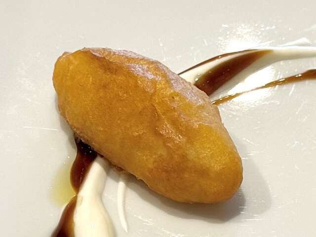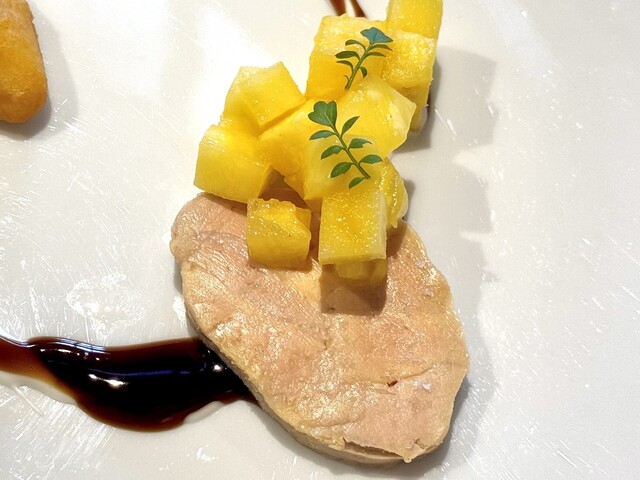 3皿目のフォワグラと黒酢の甘酢は、低温で丁寧に火入れされたフォワグラの濃厚さに、パイナップルの酸味と黒酢のコクが絶妙なバランスで寄り添います。付け合わせのポムドフィーヌは、山芋「ねばりっこ」を使った軽やかな仕上がりで、揚げ物なのに驚くほど軽やか。2種のソースが味に変化をもたらし、何度も口に運びたくなる美味しさです。