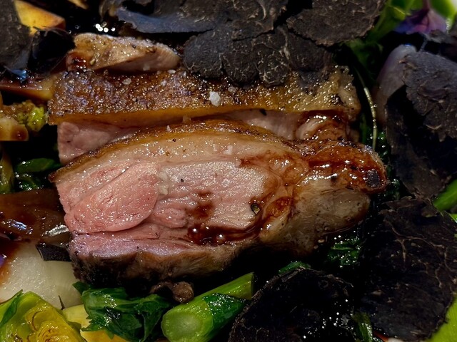 そしていよいよメインの肉料理、七谷鴨のロティ。ナイフを入れるとほんのりピンク色の断面が現れ、噛むたびにしっとりとした鴨の旨味が広がります。驚いたのは添えられた55種類もの京野菜。れんこん、芽キャベツ、アスパラなど、どれも個性がありながらも一皿として調和していて、まるで食べるガーデンのよう。黒トリュフの芳醇な香りが、全体に華やかさを添えていました。