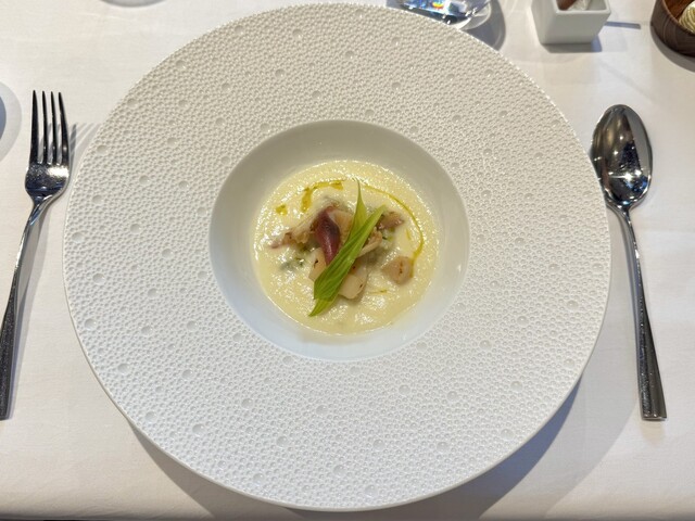 ◆春のリゾットとコキヤージュのソテー、白アスパラのヴルーテ