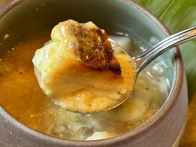 トスカーナパンの上に、真ふぐ白子のペーストと愛知県産うなぎが贅沢に重なり、赤ワインとバルサミコのソースが全体をまとめます。スモーク香を添えるのは、オリーブや桜の木などを使った香りの演出。手に持って食べるスタイルも楽しく、うなぎ好きの私にとっては至福の一品です。