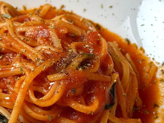 ポンマローラ(トマトソース)にシチリア産オレガノの香りがふわりと乗り、楕円形のリングイネがソースと絶妙に絡み合います。オレガノが枝からこぼれ落ちる瞬間の香りに心奪われ、まるで地中海を旅しているような気分に。