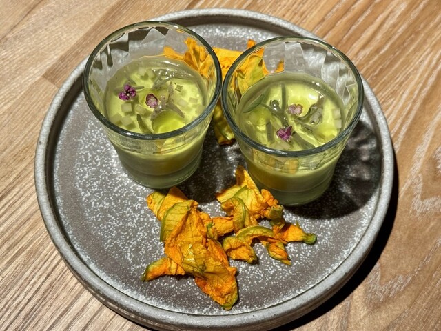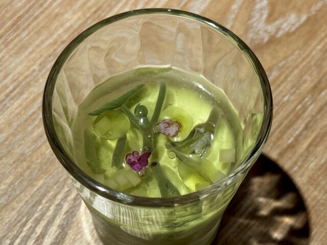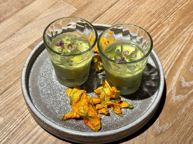 中にはズッキーニを用いた淡い緑のムース。その上には潤菜のピクルスと細かく刻まれたズッキーニのピクルスが散りばめられ、小さな食用花がひとつ添えられていました。ムースは昆布茶と出汁がベースとなっており、穏やかで深い旨味を含みつつも、喉越しはすっきりと爽やか。