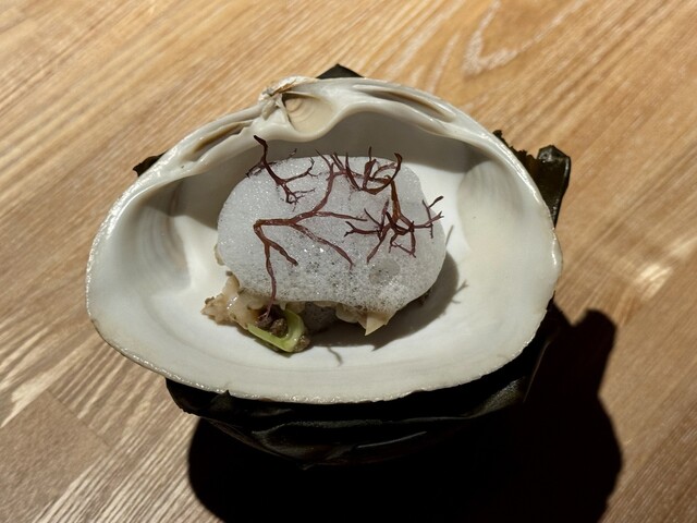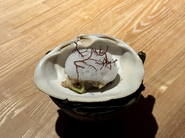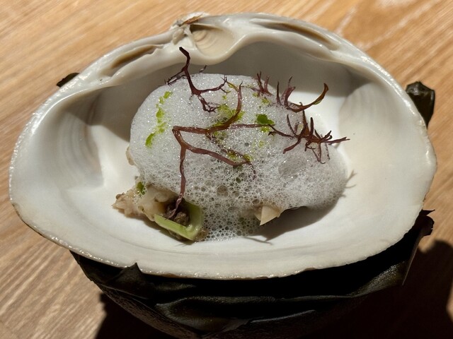 ◆ホッキ貝 海をイメージした一品として登場したこの料理は、大きなホッキ貝の殻を器に使い、上にはふんわりとしたバイマックル(こぶみかん)の泡と海藻があしらわれています。その見た目からすでに「海」を強く感じさせ、目の前に広がる日本海の断片を皿の上に閉じ込めたような印象を受けます。