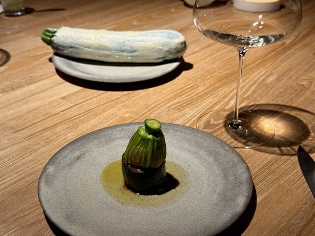 じっくりと粕漬けされたズッキーニは旨みが凝縮され、輪切りにされてお皿の上に並びます。その上には、万願寺唐辛子を焼いて作られたペーストが重なり、さらに阿岸で育った七面鳥のもも肉と砂肝をミンチにして詰めた花ズッキーニが堂々と鎮座。