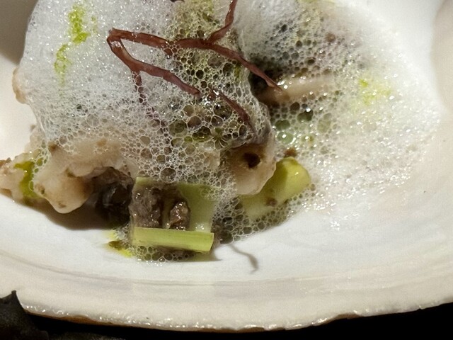 泡の下には、薪焼きした後にスモークをかけた北寄貝を中心に、金沢産のスナップエンドウ、岩海苔、メカブ、シーアスパラガスが繊細に配置されています。そして、提供時にはホッキ貝の紐で作った緑色のソース「レチェ・デ・ティグレ」が泡の上から流しかけられ、その瞬間に広がります。