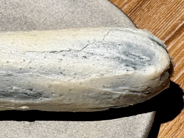 酒粕と青カビチーズを練り合わせた濃厚なペーストをズッキーニの表面にしっかりと塗りこみ、丸ごと包み込んでから3日間熟成。
