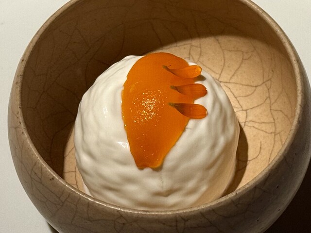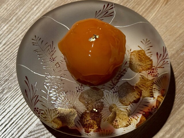 まるで大きなおはじきのような平たい球体の器に盛りつけられたこの一品は、まさにアートピースのような佇まいです。中央には卵の黄身のように美しく丸いフォルムを描いたオレンジ色のドーム。その表面には金箔がひらりと一枚添えられ、まるで高貴な宝石のように静かに輝きを放っています。