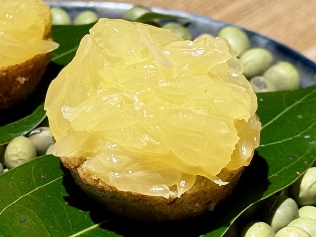 続く日向夏のタルトは、台湾茶を練り込んだ香ばしい土台に、生姜のクリームをふんわりと重ね、上には瑞々しい日向夏。爽やかな柑橘とピリリとした刺激が絶妙なバランスです。