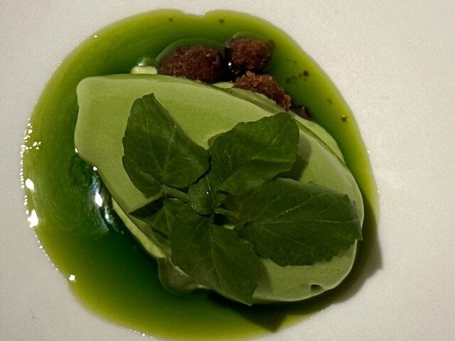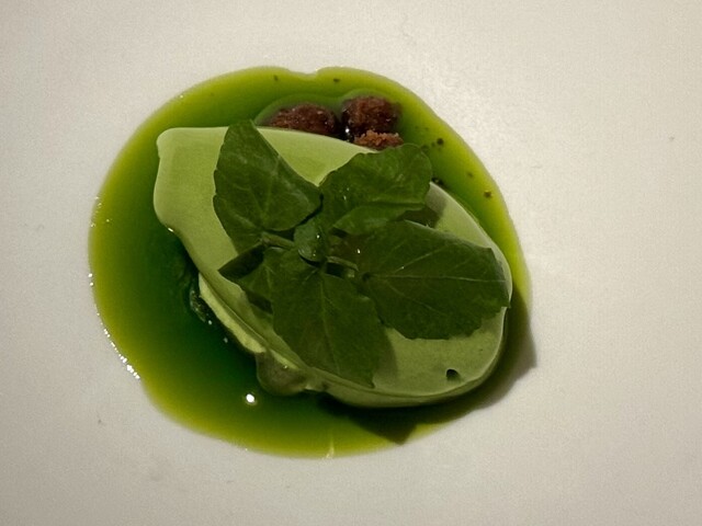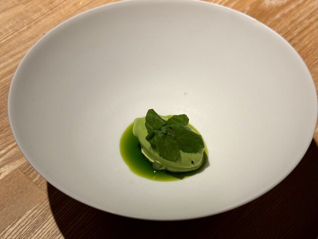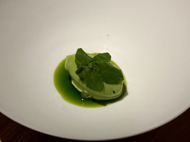 真っ白な器の中央にそっと佇むのは、福井県池田町産のクレソンを使ったソルベ。清らかな水で知られる土地で育ったクレソンは、みずみずしさとともに力強い野生味を宿しており、その個性がそのまま氷の中に閉じ込められています。グリーンの鮮やかなソルベは、下に敷かれた緑のソースと一体となり、まるで森の中の泉のような景色を描き出しています。その頂にはフレッシュなクレソンの葉がひと房、美しくあしらわれ、風に揺れる若葉のようなアクセントに。口に運ぶと、ひんやりとした口当たりと共にクレソン特有のピリッとした辛味とほのかな苦味が広がり、後味には爽やかさと清涼感が残ります。甘さ控えめで潔く、自然の恵みをダイレクトに感じられる、大地のエッセンスそのもののようなソルベです。